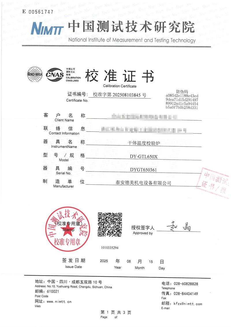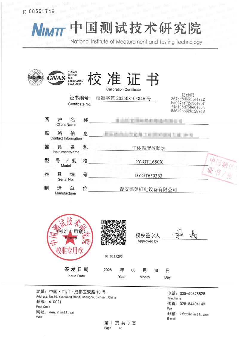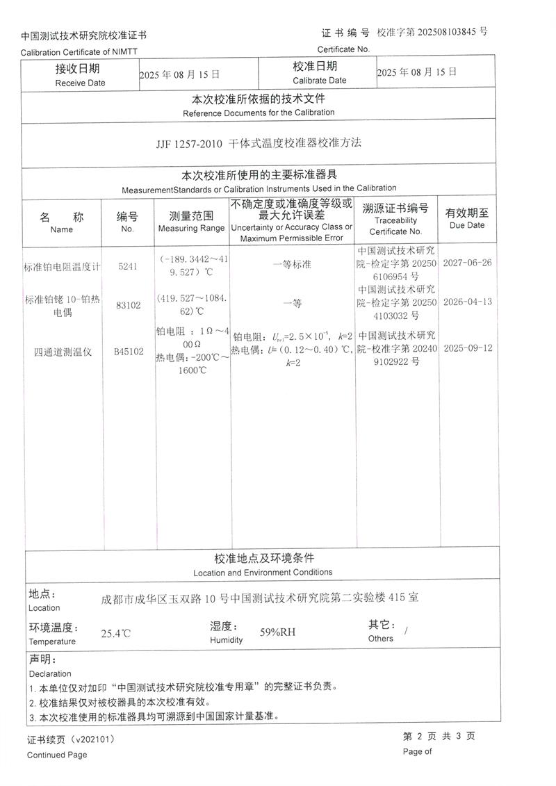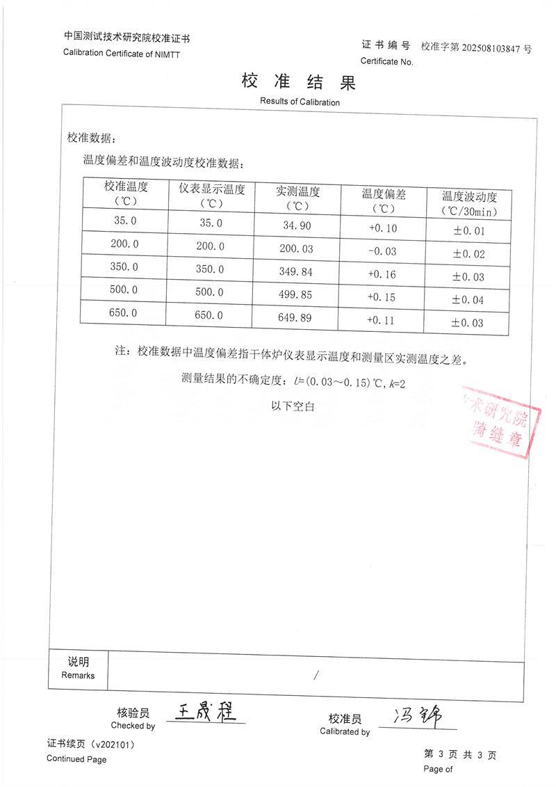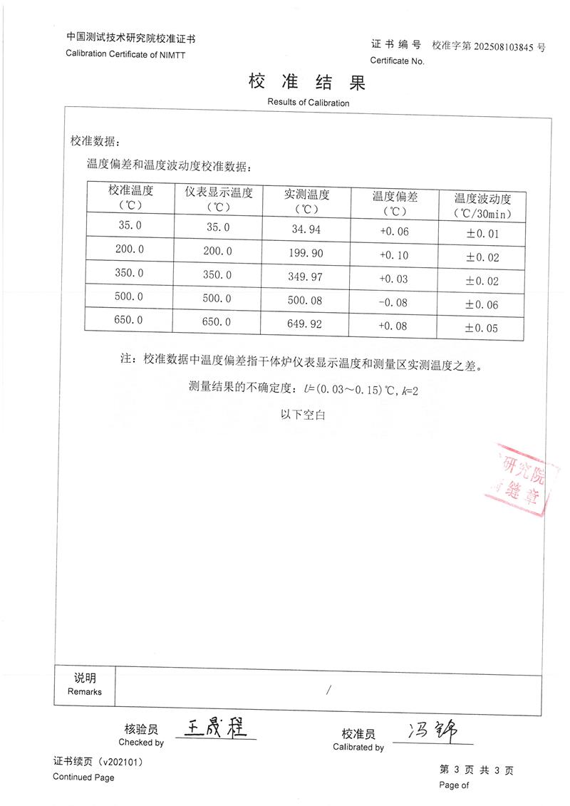 干體爐(室溫+5℃~650℃)校準(zhǔn)證書 2025-8-20 本文被閱讀 1913 次