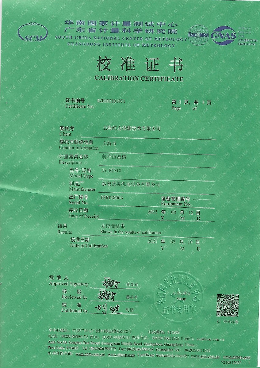 | 上一條:西安電子科技有限責(zé)任公司-智能高精度制冷恒溫槽 | 下一條:便攜式溫濕度檢定箱(-10-60℃)校準(zhǔn)證書 |