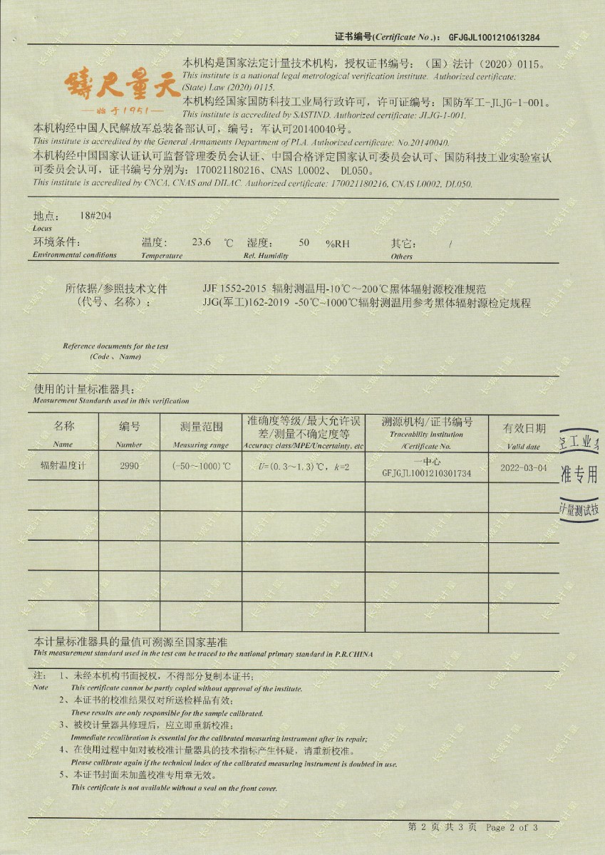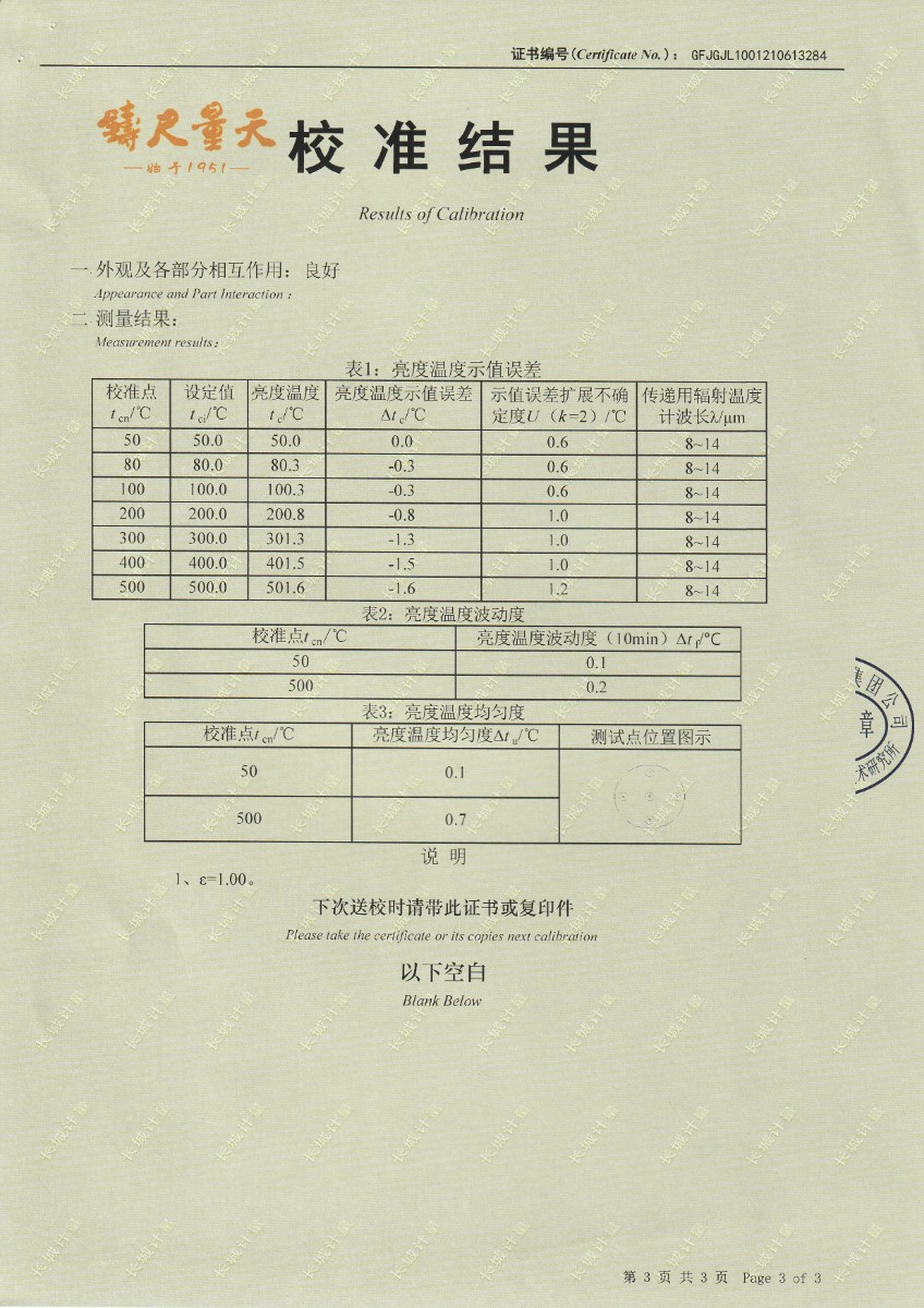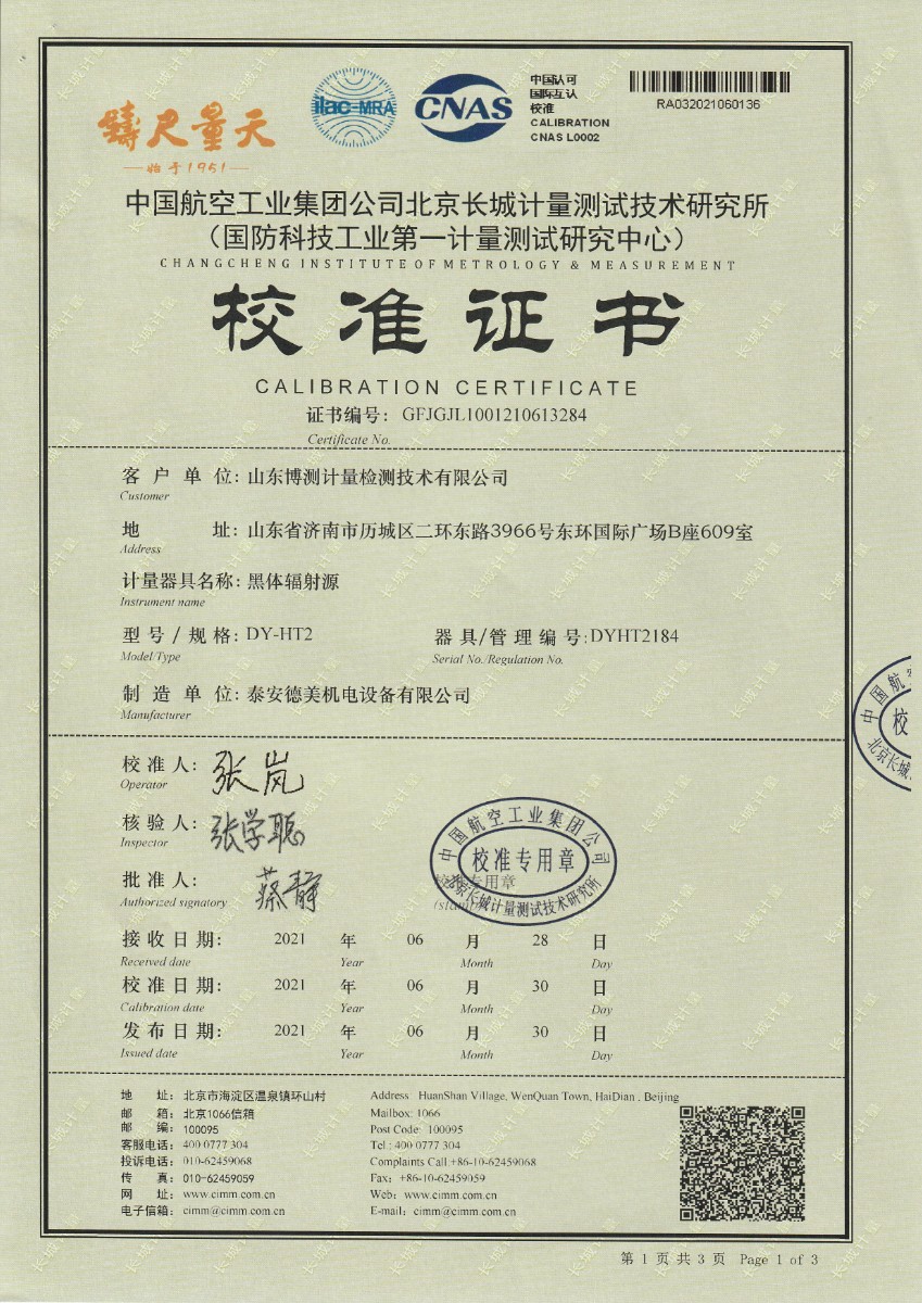 上一條:哈爾濱永創(chuàng)計量檢測有限公司-溫濕度檢定箱 | 下一條:超低溫面源黑體爐(-40-80℃)校準證書 |
