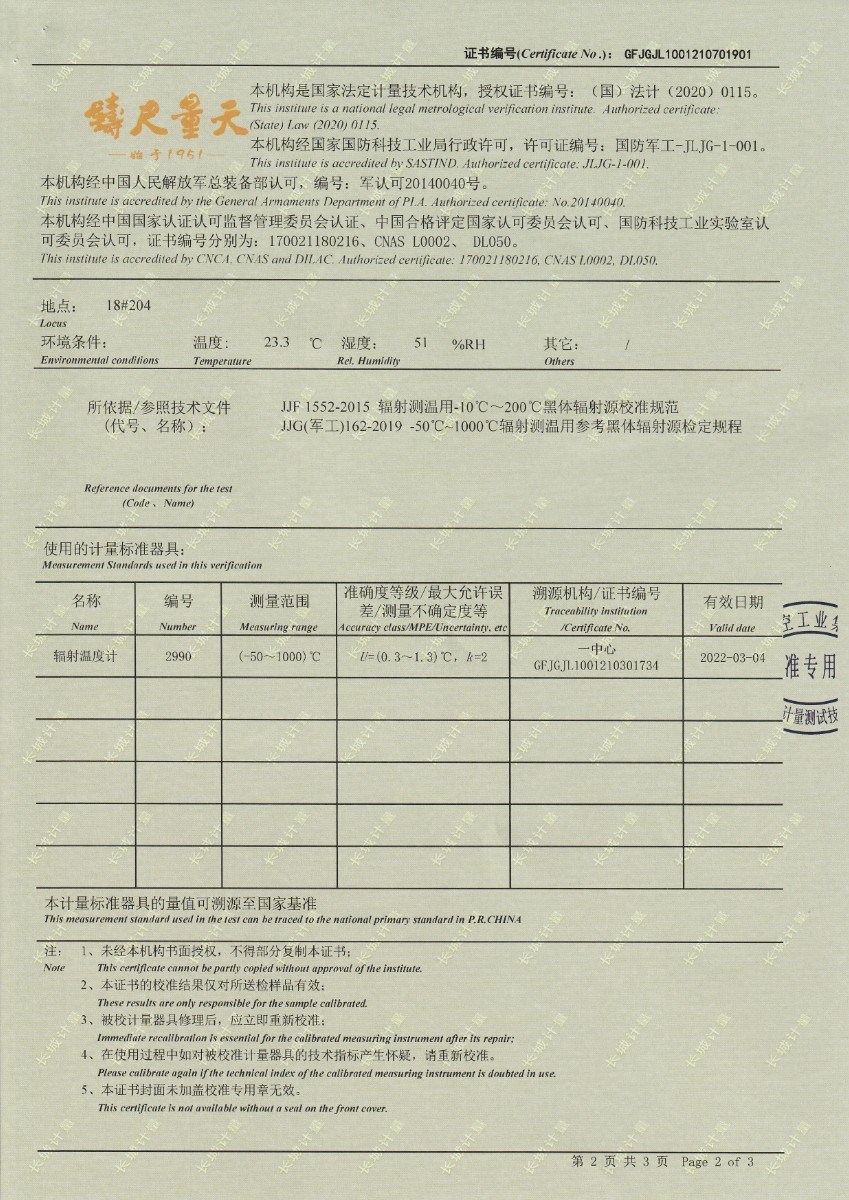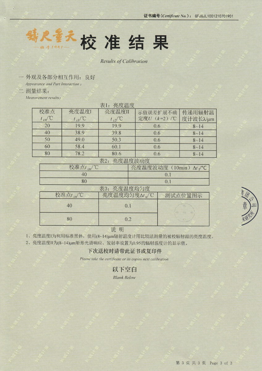 上一條:山東博測計(jì)量檢測技術(shù)有限公司-黑體輻射源 | 下一條:超低溫面源黑體爐(-40-80℃)校準(zhǔn)證書 |