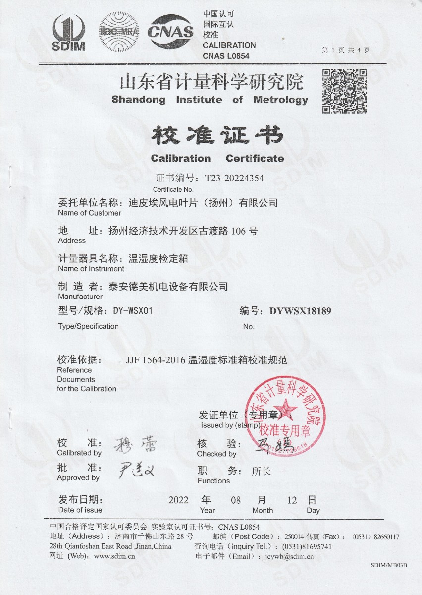 迪皮埃風電葉片(揚州)有限公司-溫濕度檢定箱 2022-8-22 本文被閱讀 13271 次