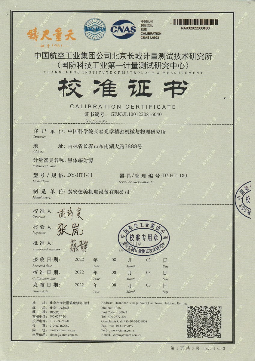 中國科學(xué)院長春光學(xué)精密機(jī)械與物理研究所-黑體爐DY-HT1-11 2022-9-5 本文被閱讀 12205 次