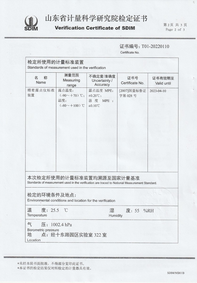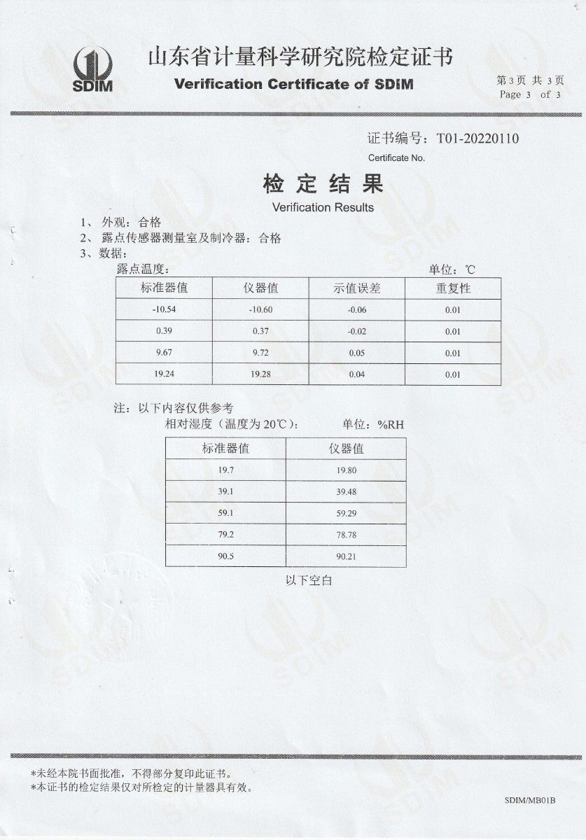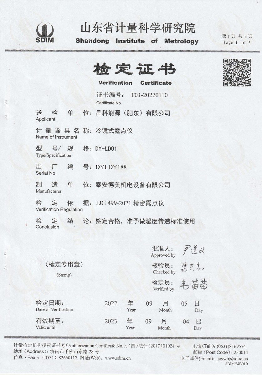 晶科能源(肥東)有限公司-冷鏡式露點儀檢定證書 2022-9-26 本文被閱讀 15022 次