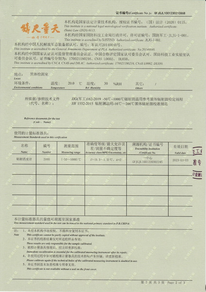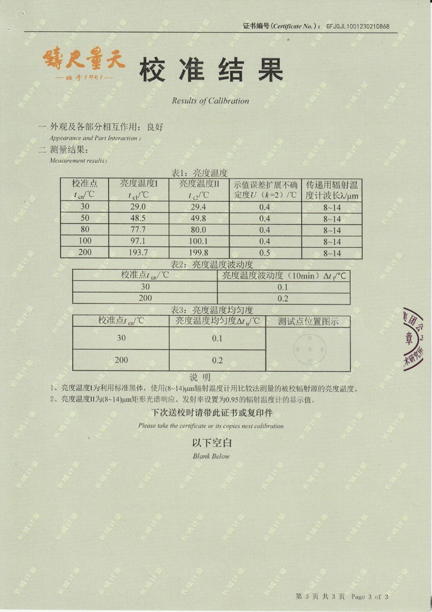 上一條:西安和其光電科技股份有限公司 低溫浴式黑體輻射源 校準(zhǔn)證書 | 下一條:超低溫面源黑體爐(-40-80℃)校準(zhǔn)證書 |