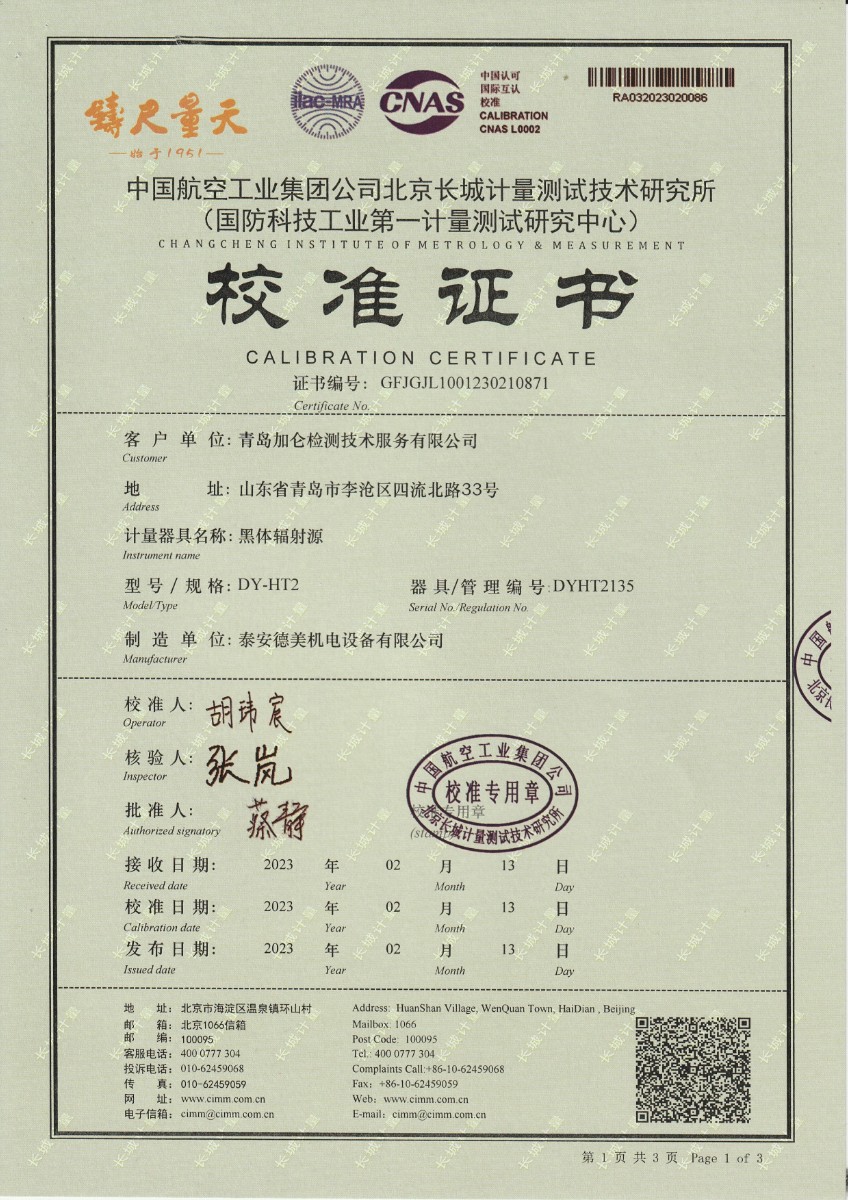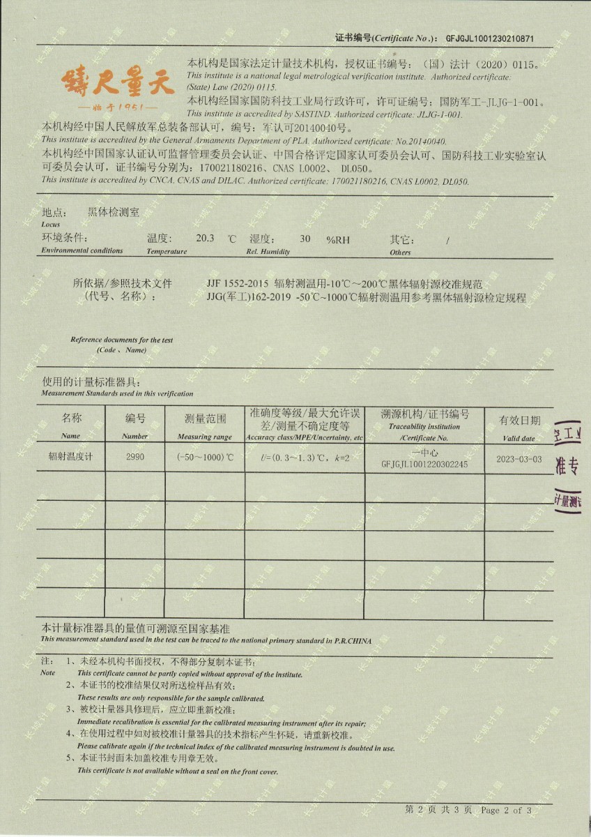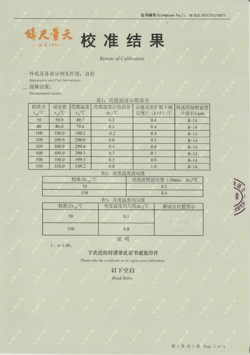 上一條:中國(guó)民航大學(xué) 黑體爐 校準(zhǔn)證書(shū) | 下一條:超低溫面源黑體爐(-40-80℃)校準(zhǔn)證書(shū) |