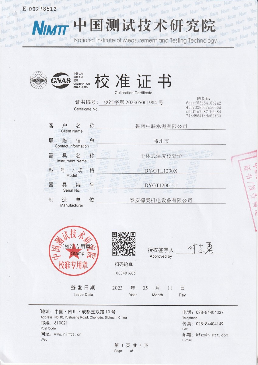 上一條:魯南中聯(lián)水泥有限公司 溫度校驗(yàn)儀 校準(zhǔn)證書(shū) | 下一條:便攜式干體爐(-30-150℃)校準(zhǔn)證書(shū) |