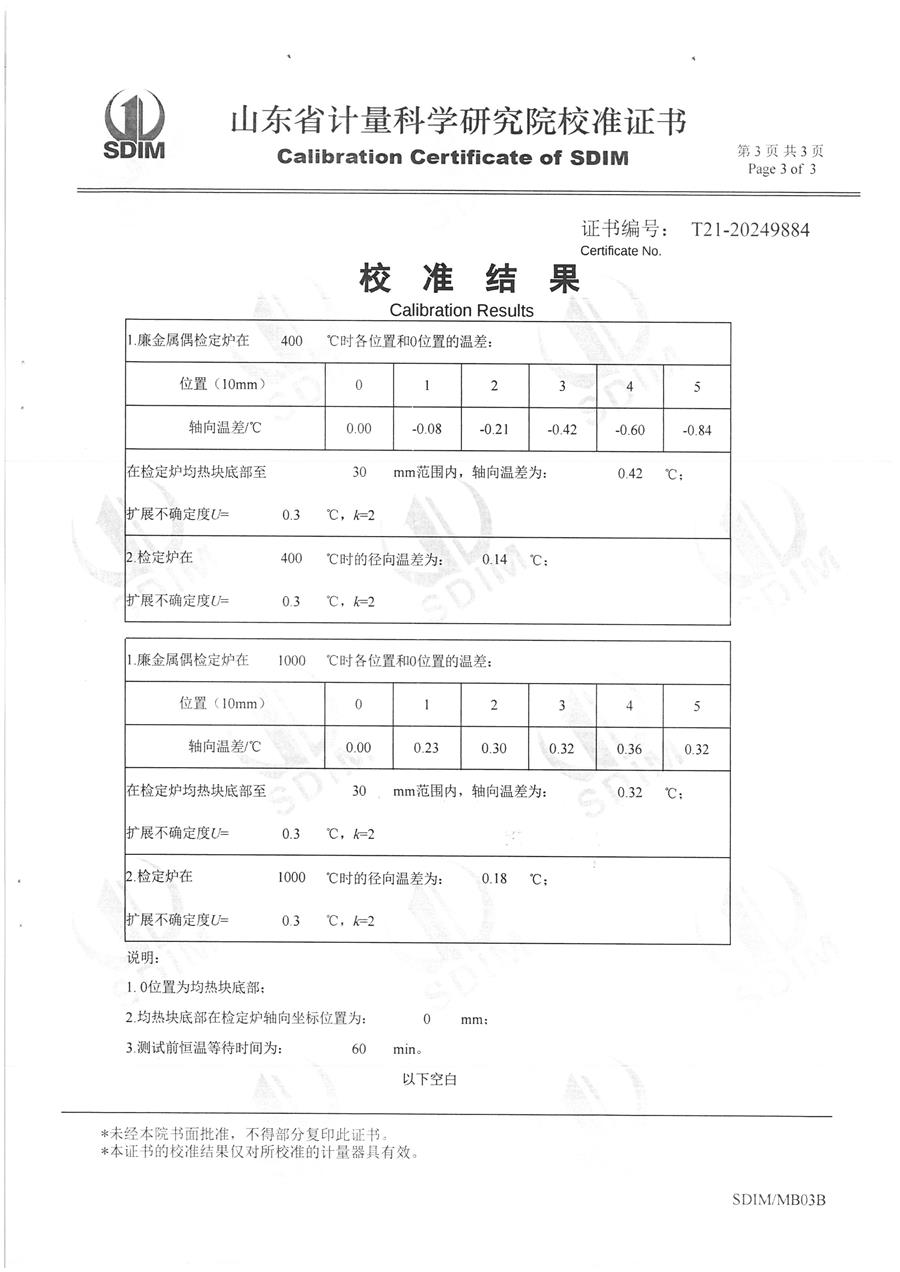 廉金屬熱電偶檢定爐(300-1200℃)校準(zhǔn)證書