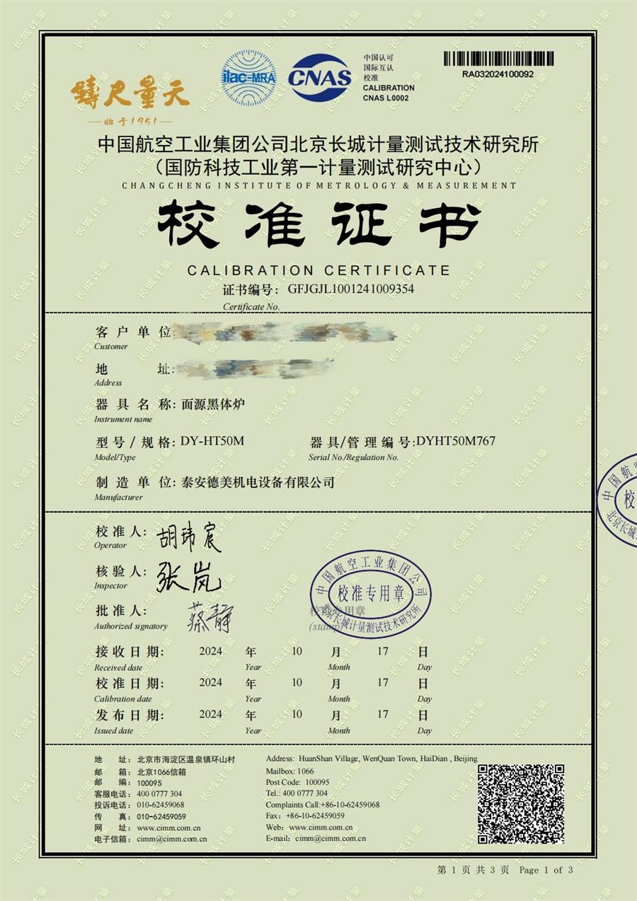 面源黑體爐(+5-300℃)校準證書 2024-11-6 本文被閱讀 6469 次