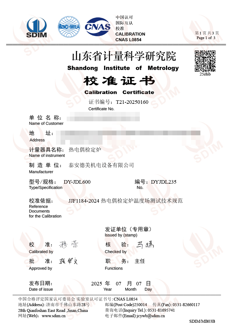 熱電偶檢定爐(300-1200℃)校準證書 2025-7-10 本文被閱讀 2520 次