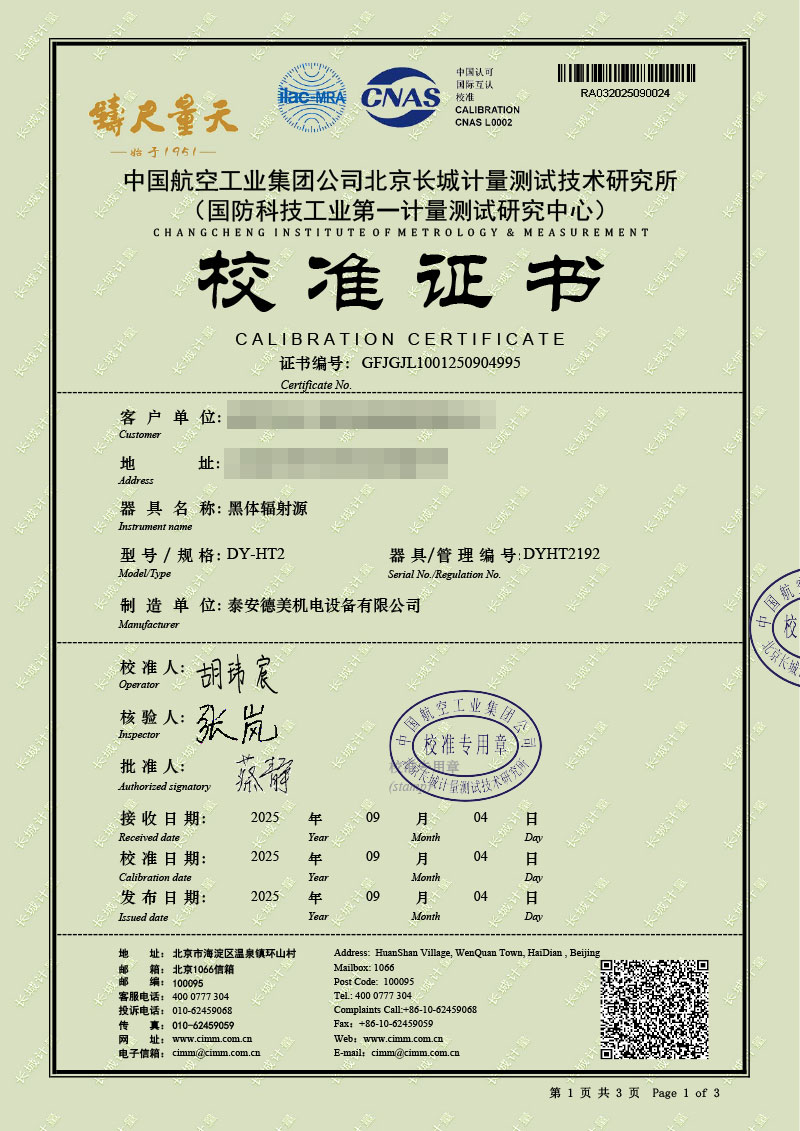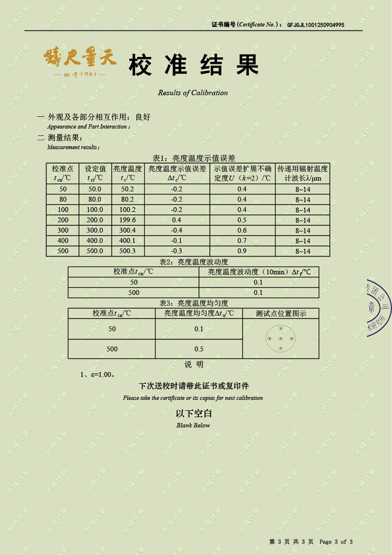 黑體輻射源(50-500℃)校準證書 2025-9-12 本文被閱讀 1048 次