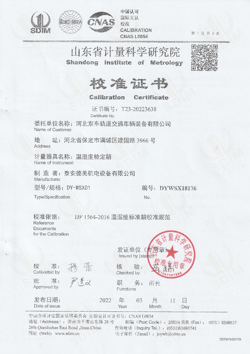 上一條:河北京車軌道交通車輛裝備有限公司-低電勢掃描開關(guān) | 下一條:超低溫面源黑體爐(-40-80℃)校準(zhǔn)證書 |