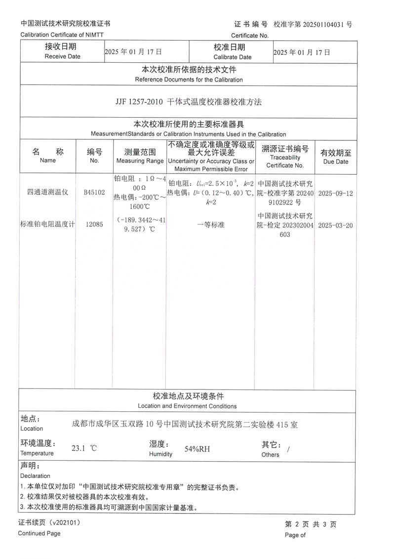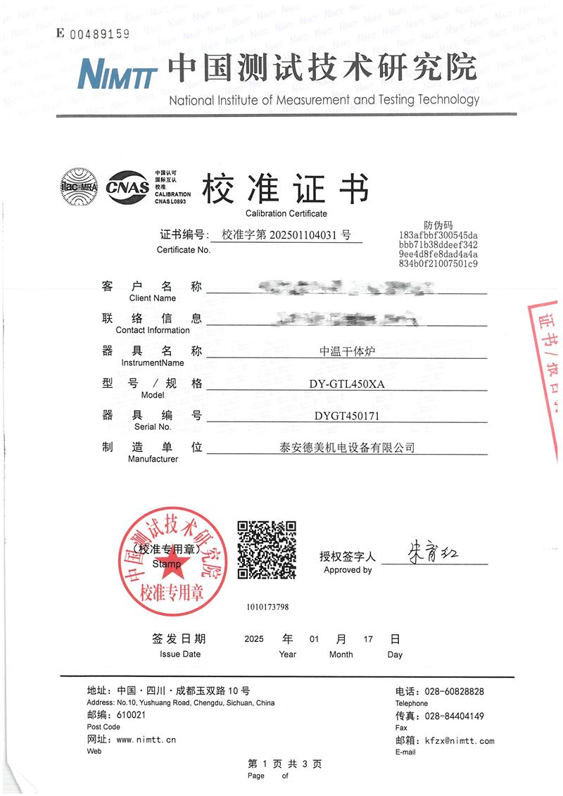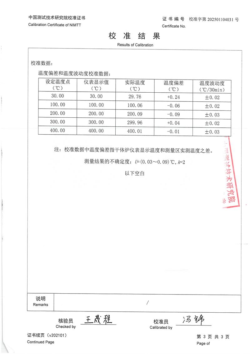 中溫干體爐(室溫+5~400℃)校準證書 2025-1-20 本文被閱讀 4684 次