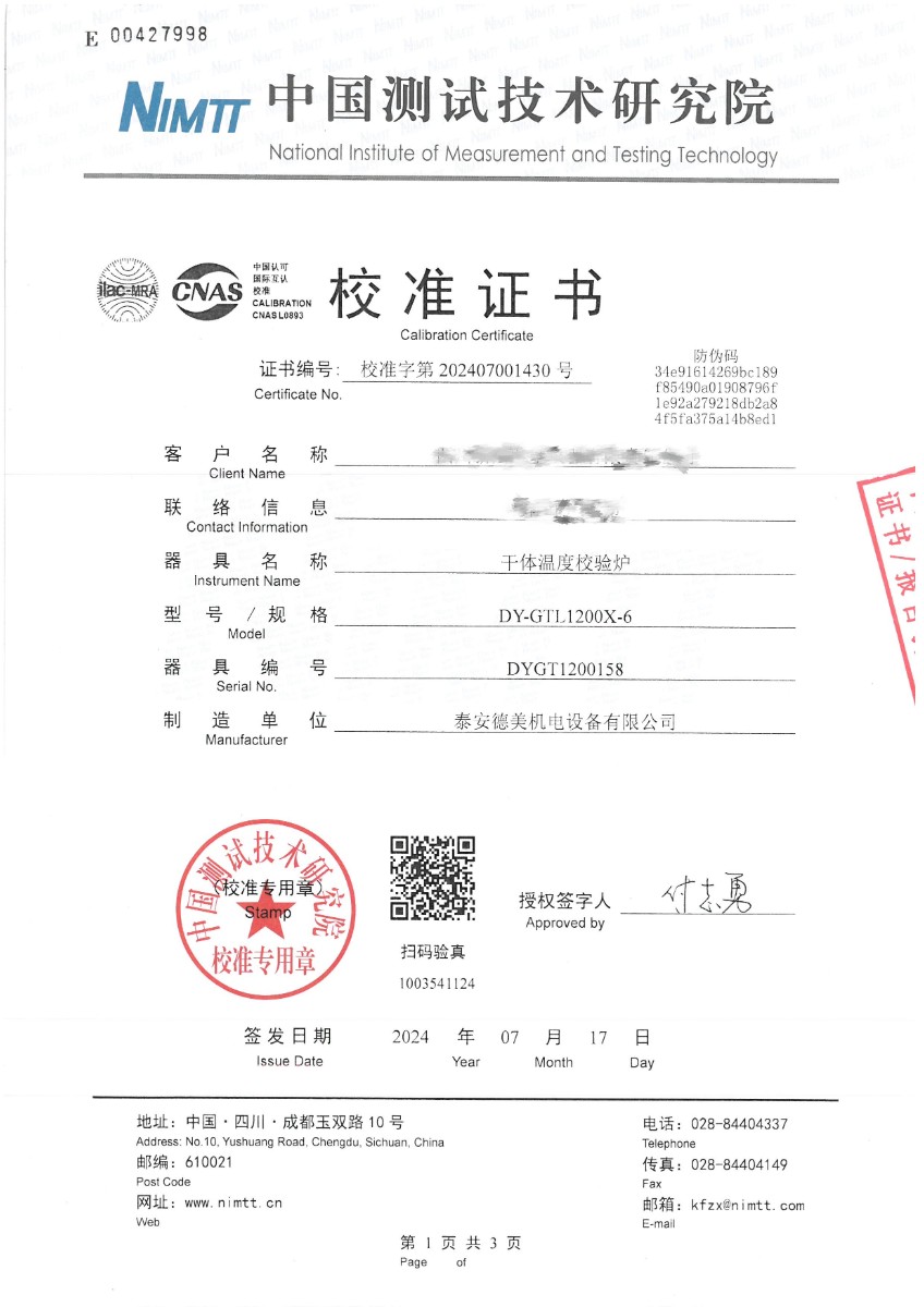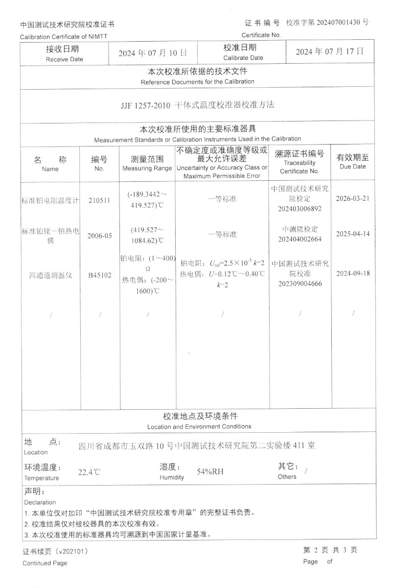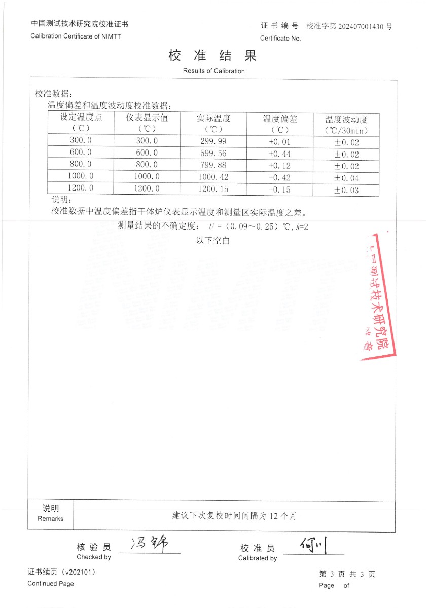 干體爐(300~1200)校準(zhǔn)證書 2024-7-19 本文被閱讀 6332 次