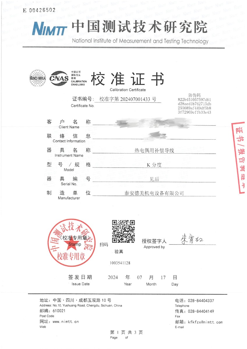 熱電偶用補(bǔ)償導(dǎo)線K分度校準(zhǔn)證書