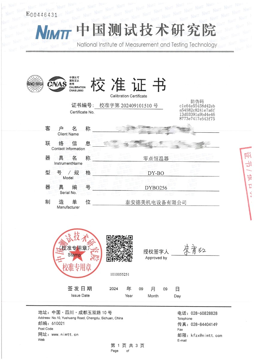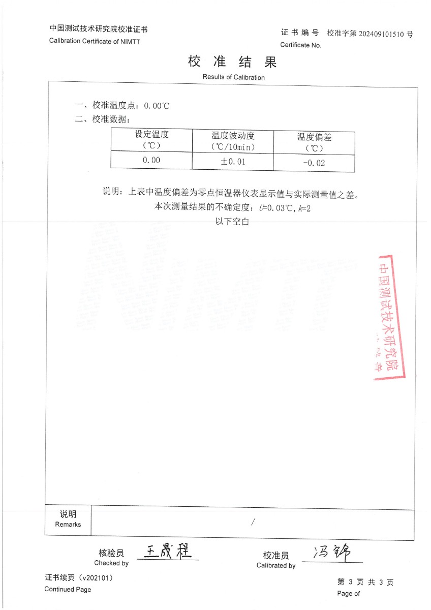 零點恒溫器校準證書 2024-9-11 本文被閱讀 6295 次