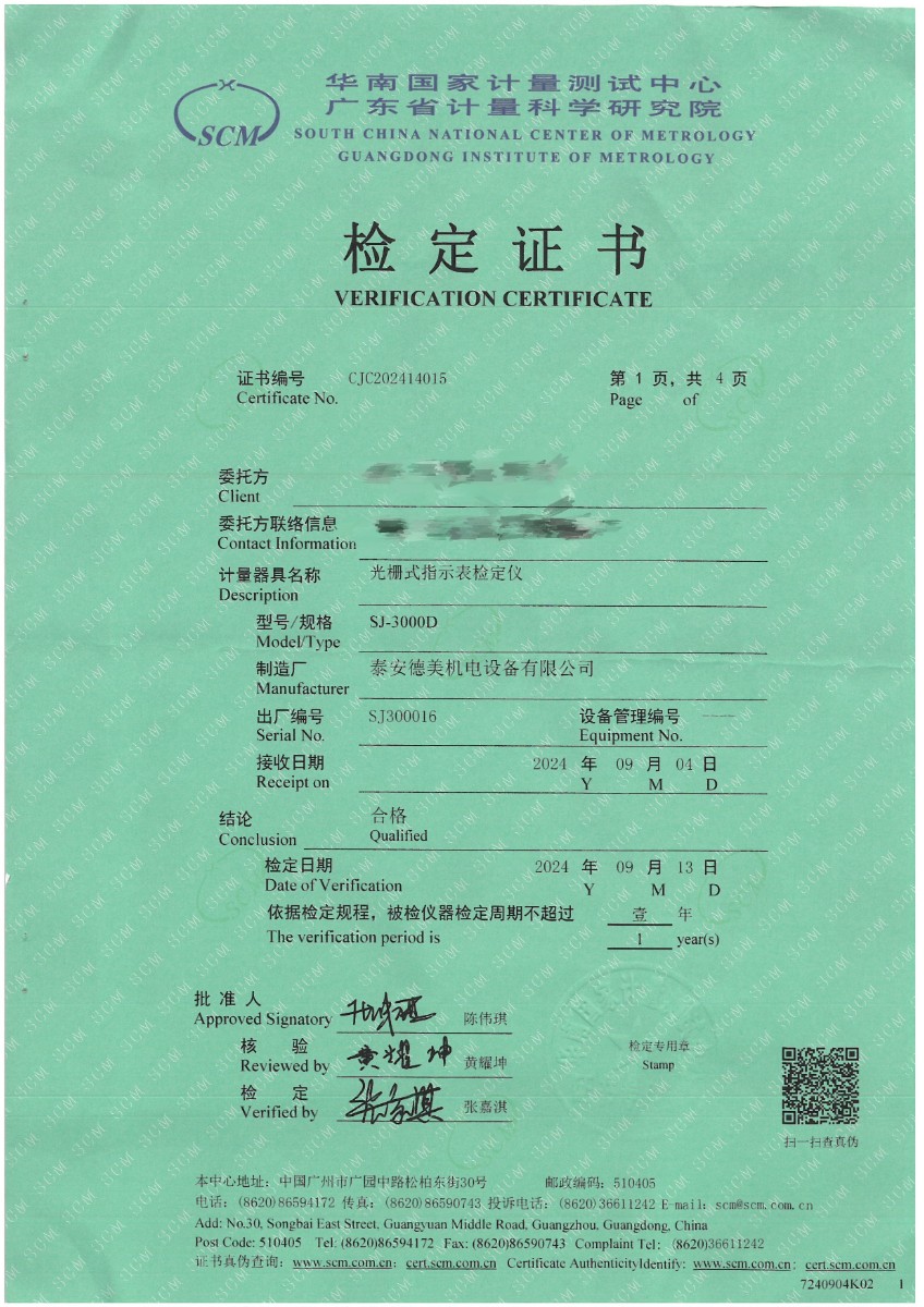 光柵式指示表檢定儀檢定證書 2024-9-20 本文被閱讀 6070 次