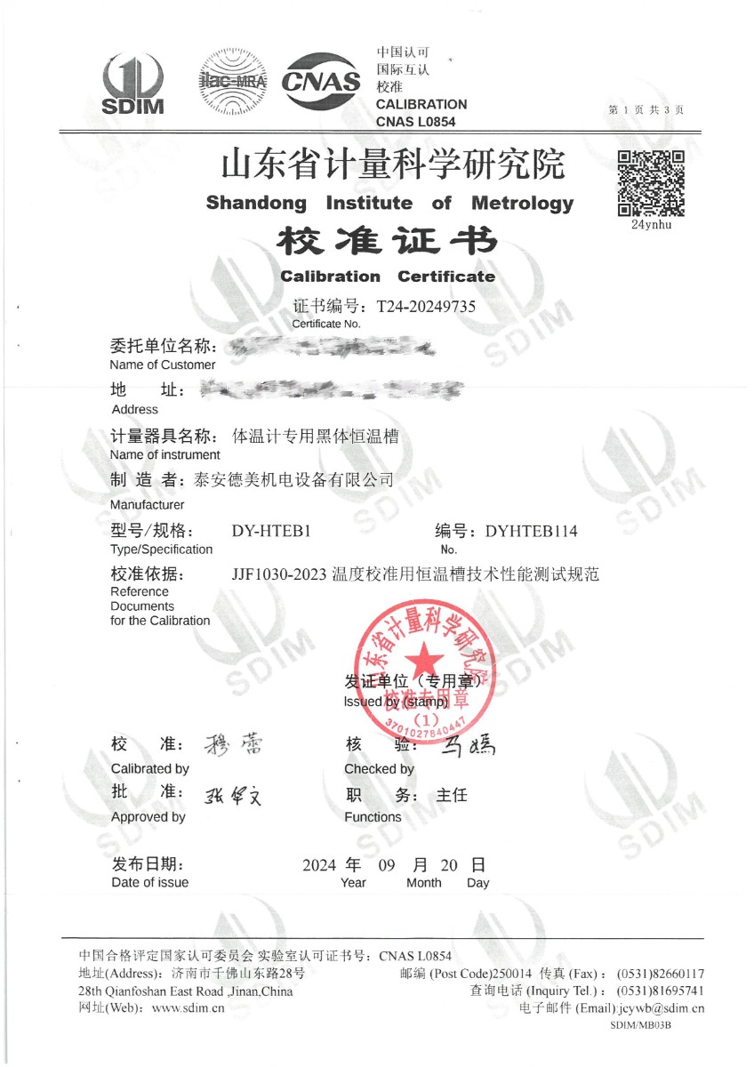 體溫計(jì)專用黑體恒溫槽(-20~100℃)校準(zhǔn)證書