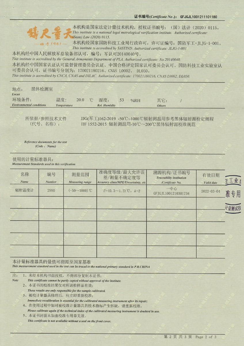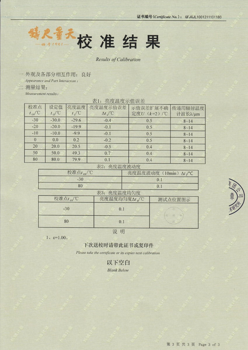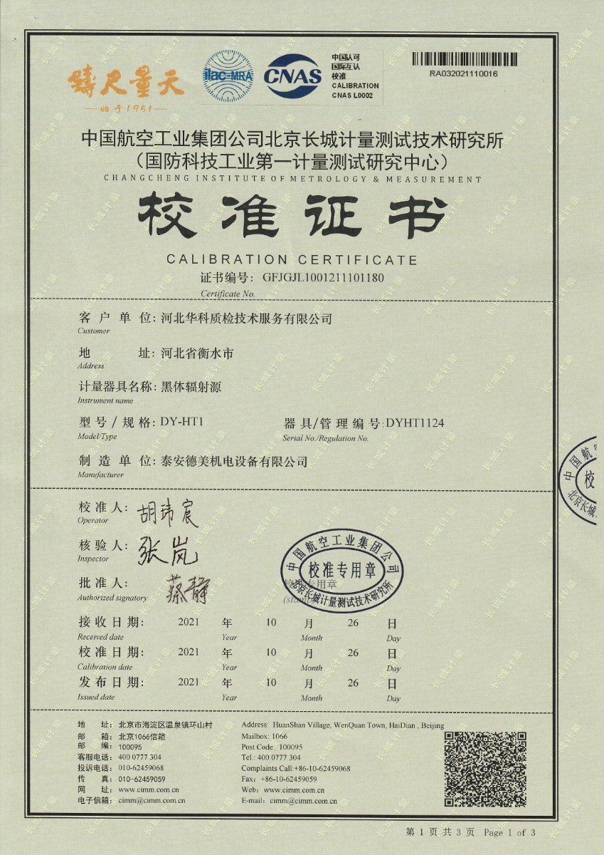 | 上一條:東營市安全工器具質(zhì)量檢測有限公司-黑體輻射源(50-500℃) | 下一條:便攜式干體爐(-30-150℃)校準證書 |