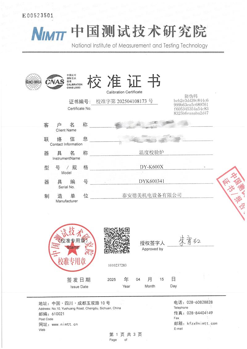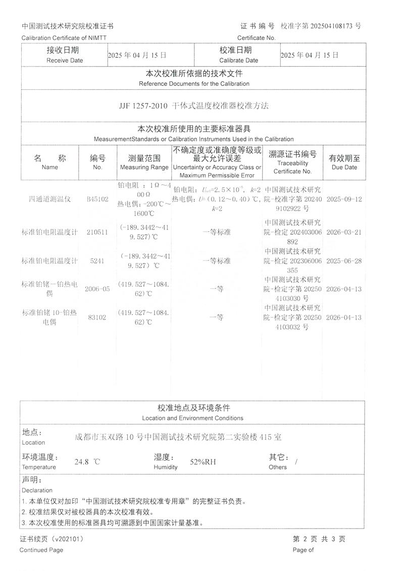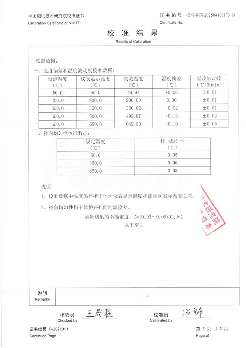 溫度校驗爐(50~650℃)校準證書 2025-4-30 本文被閱讀 2802 次