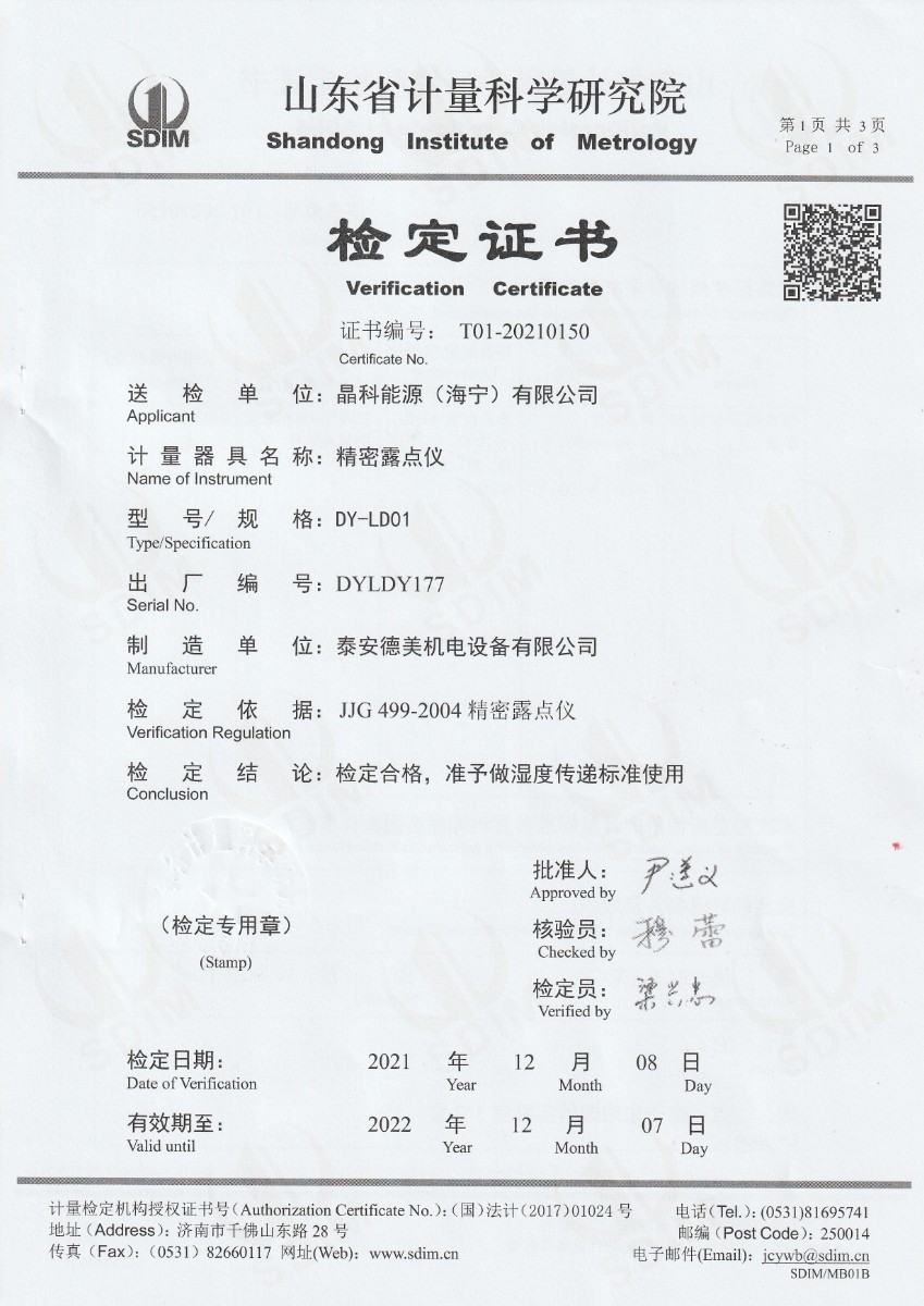 上一條:安徽晶科能源有限公司-精密露點(diǎn)儀(溫度) | 下一條:超低溫面源黑體爐(-40-80℃)校準(zhǔn)證書 |