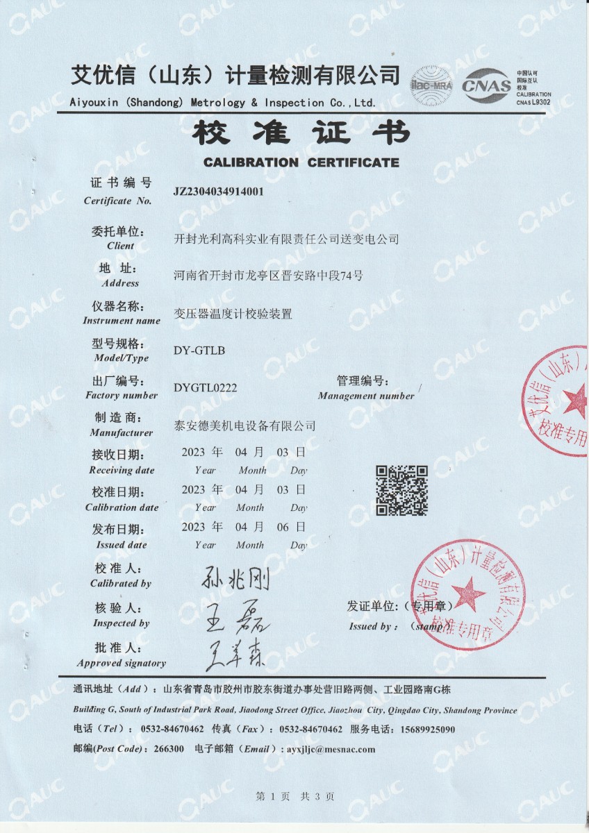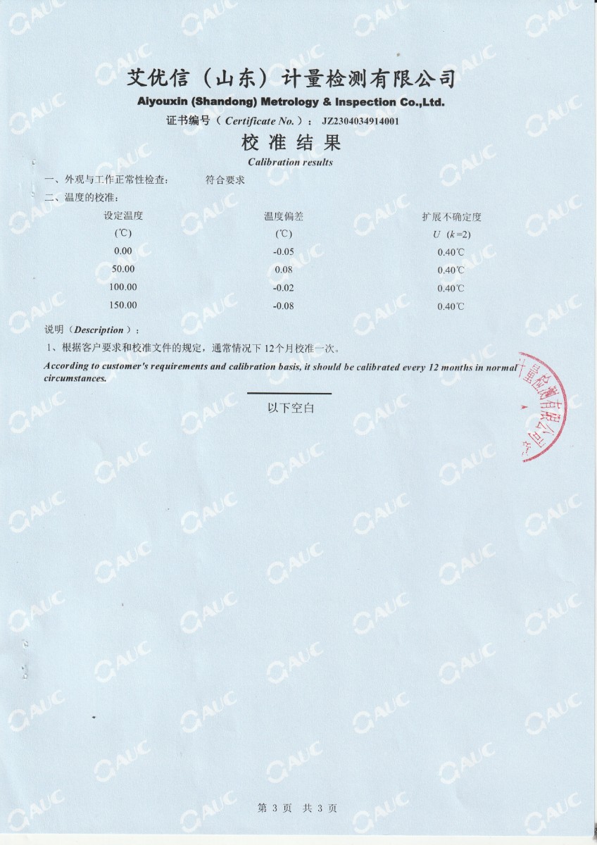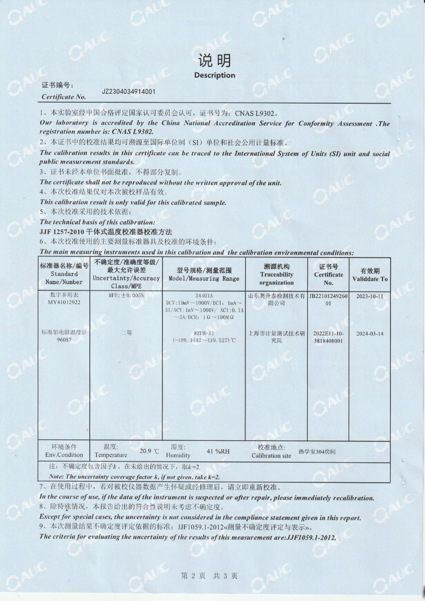 上一條:中財鋰膜(南京)有限公司 中溫干體爐 校準證書 | 下一條:便攜式干體爐(-30-150℃)校準證書 |