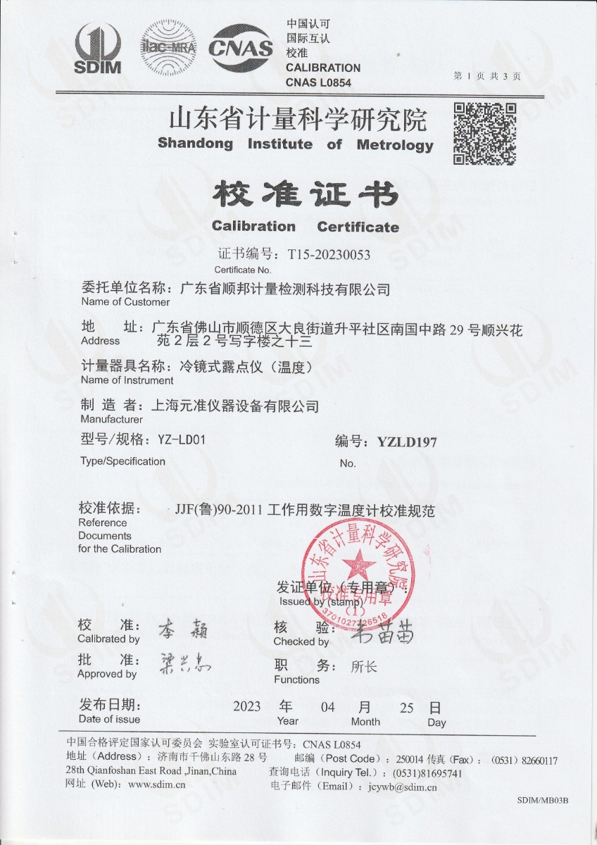 上一條:廣東省順邦計(jì)量檢測(cè)科技有限公司 冷鏡式露點(diǎn)儀 檢定證書 | 下一條:超低溫面源黑體爐(-40-80℃)校準(zhǔn)證書 |
