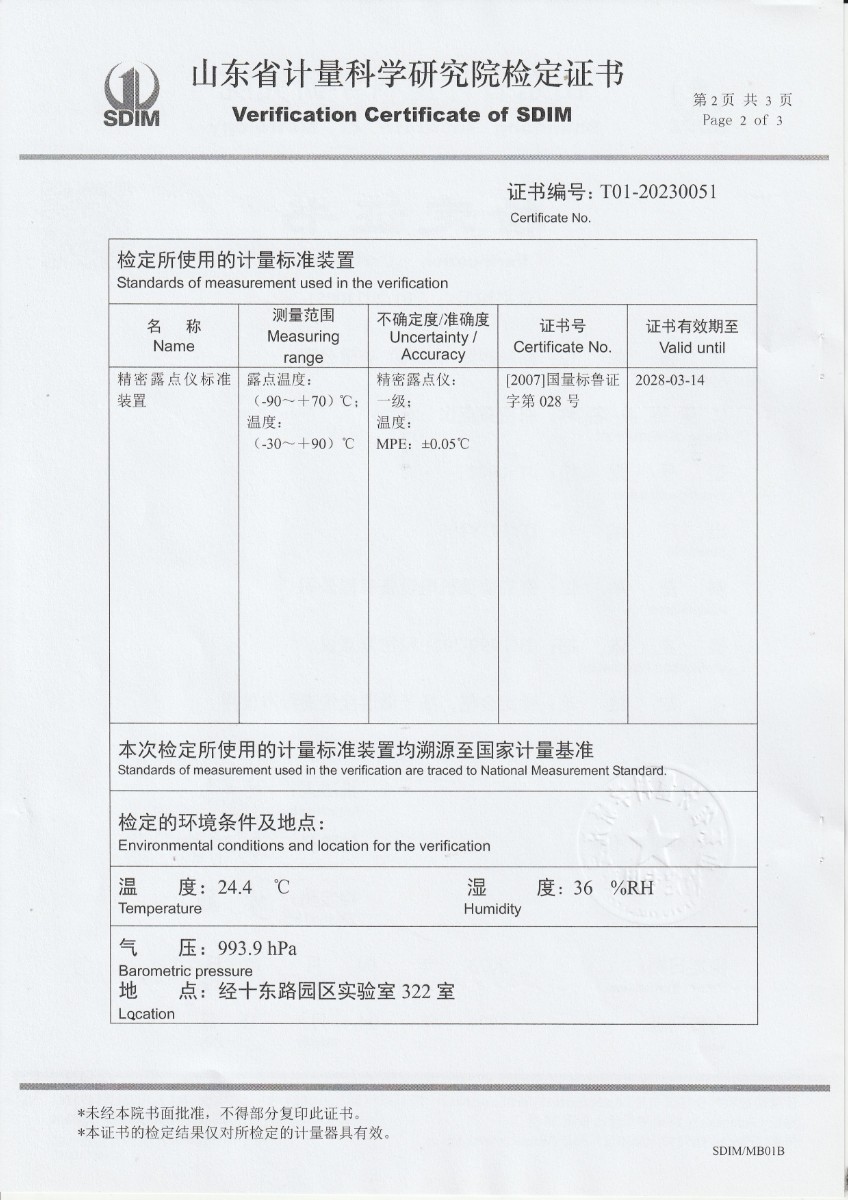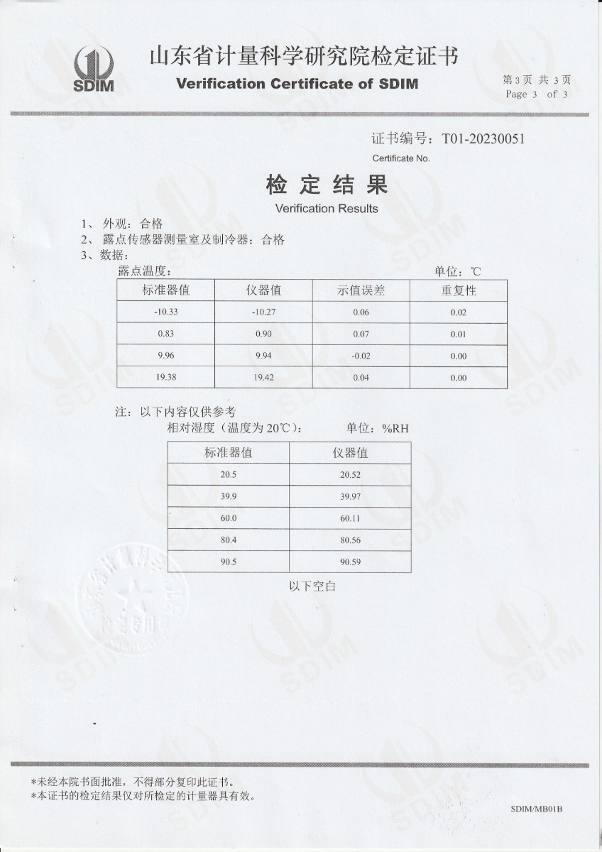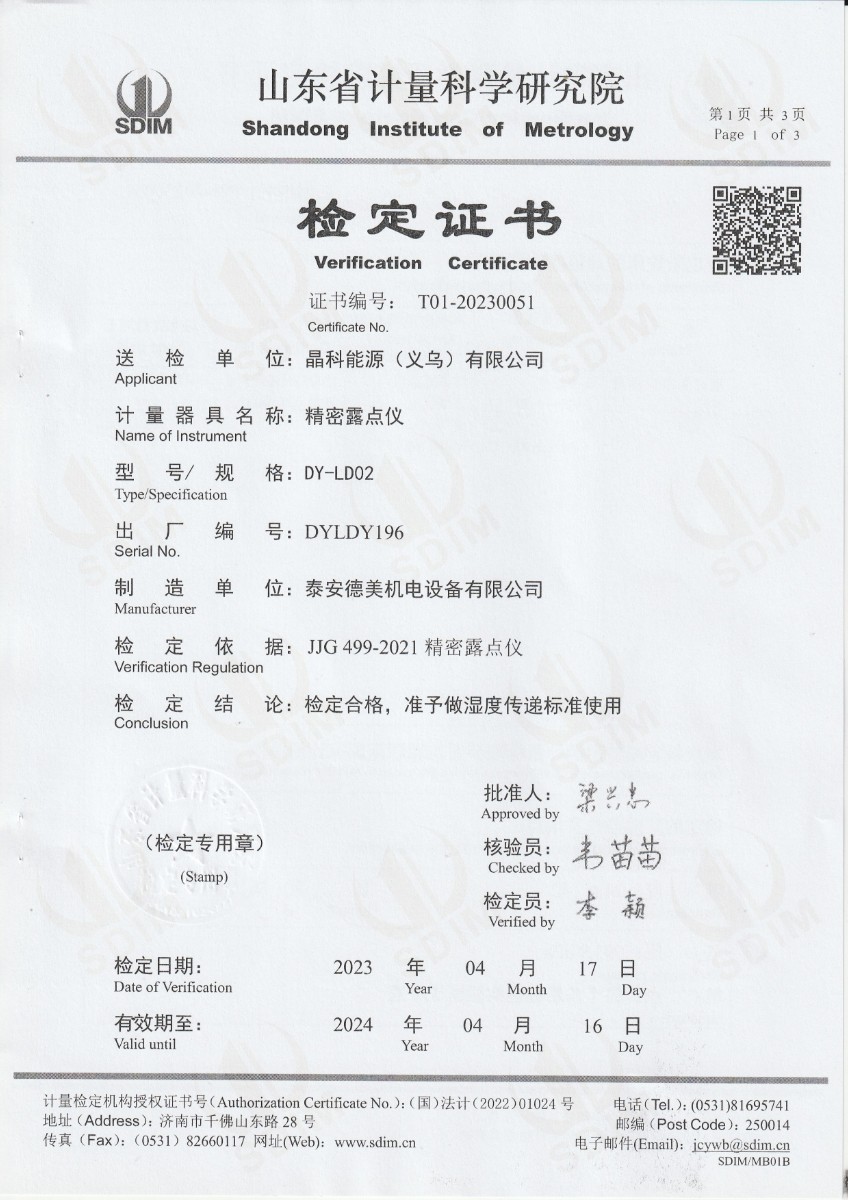 晶科能源(義烏)有限公司 精密露點儀 檢定證書 2023-5-4 本文被閱讀 11151 次