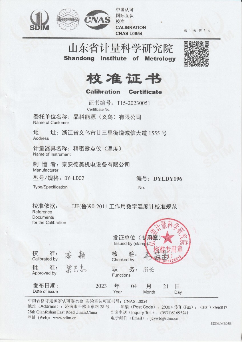 上一條:晶科能源(義烏)有限公司 精密露點(diǎn)儀 檢定證書(shū) | 下一條:超低溫面源黑體爐(-40-80℃)校準(zhǔn)證書(shū) |