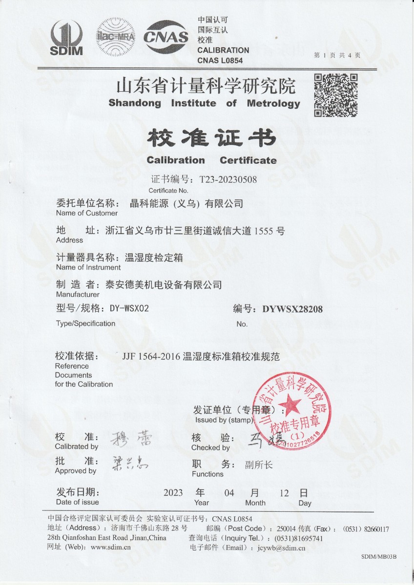 上一條:晶科能源(義烏)有限公司 精密露點(diǎn)儀(溫度)校準(zhǔn)證書 | 下一條:超低溫面源黑體爐(-40-80℃)校準(zhǔn)證書 |