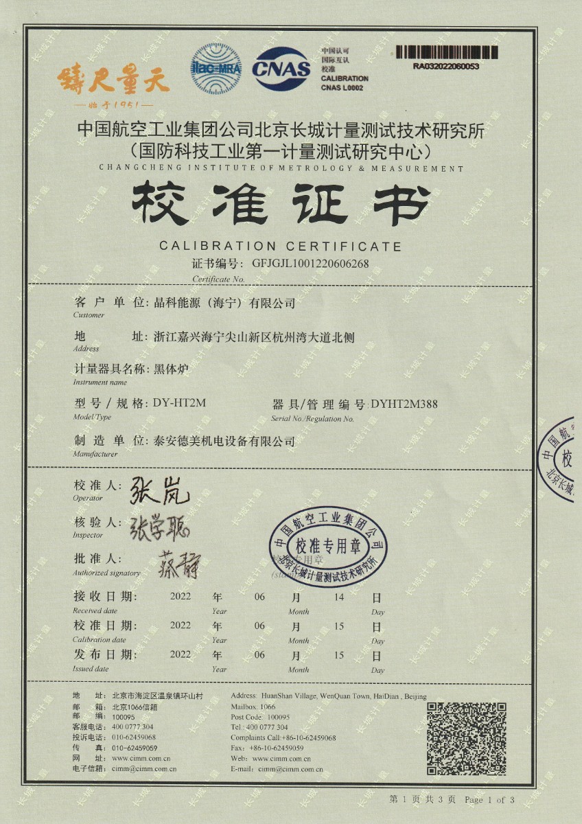 晶科能源(海寧)有限公司-黑體爐 2022-7-5 本文被閱讀 13987 次