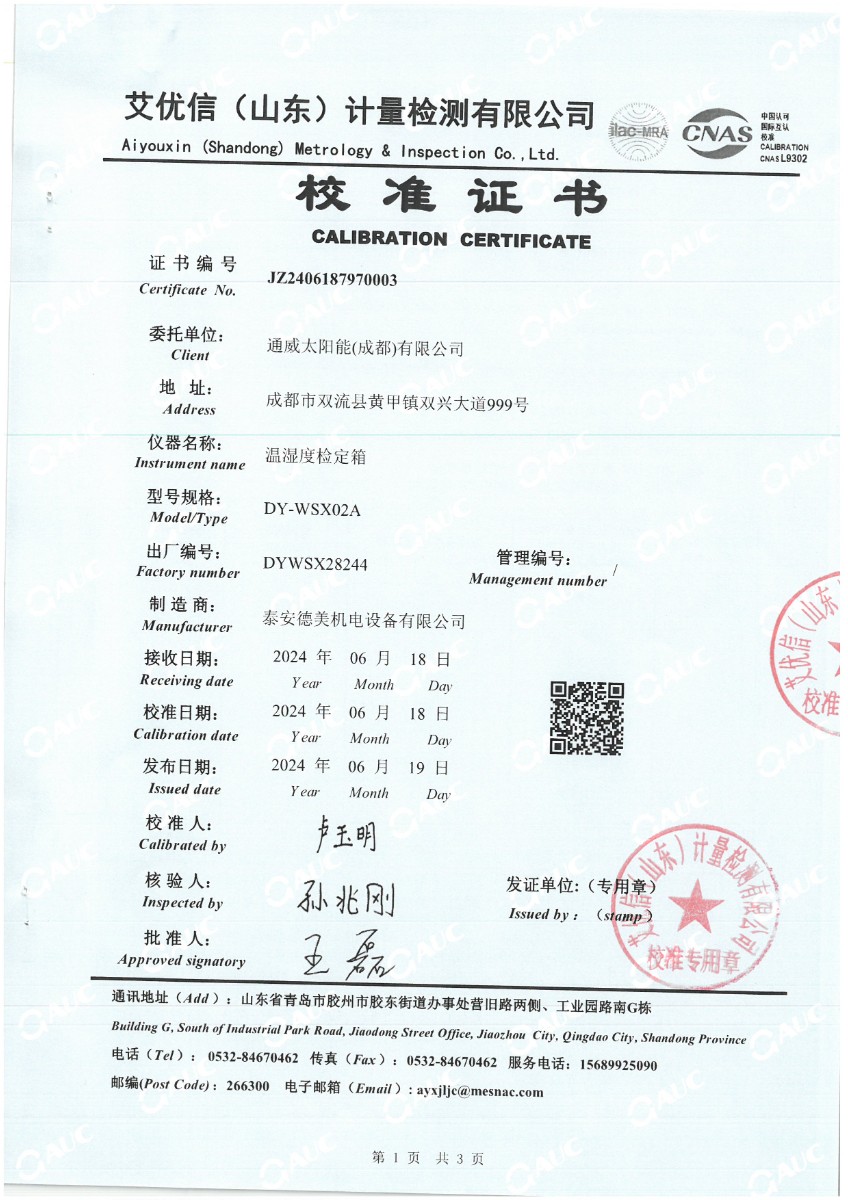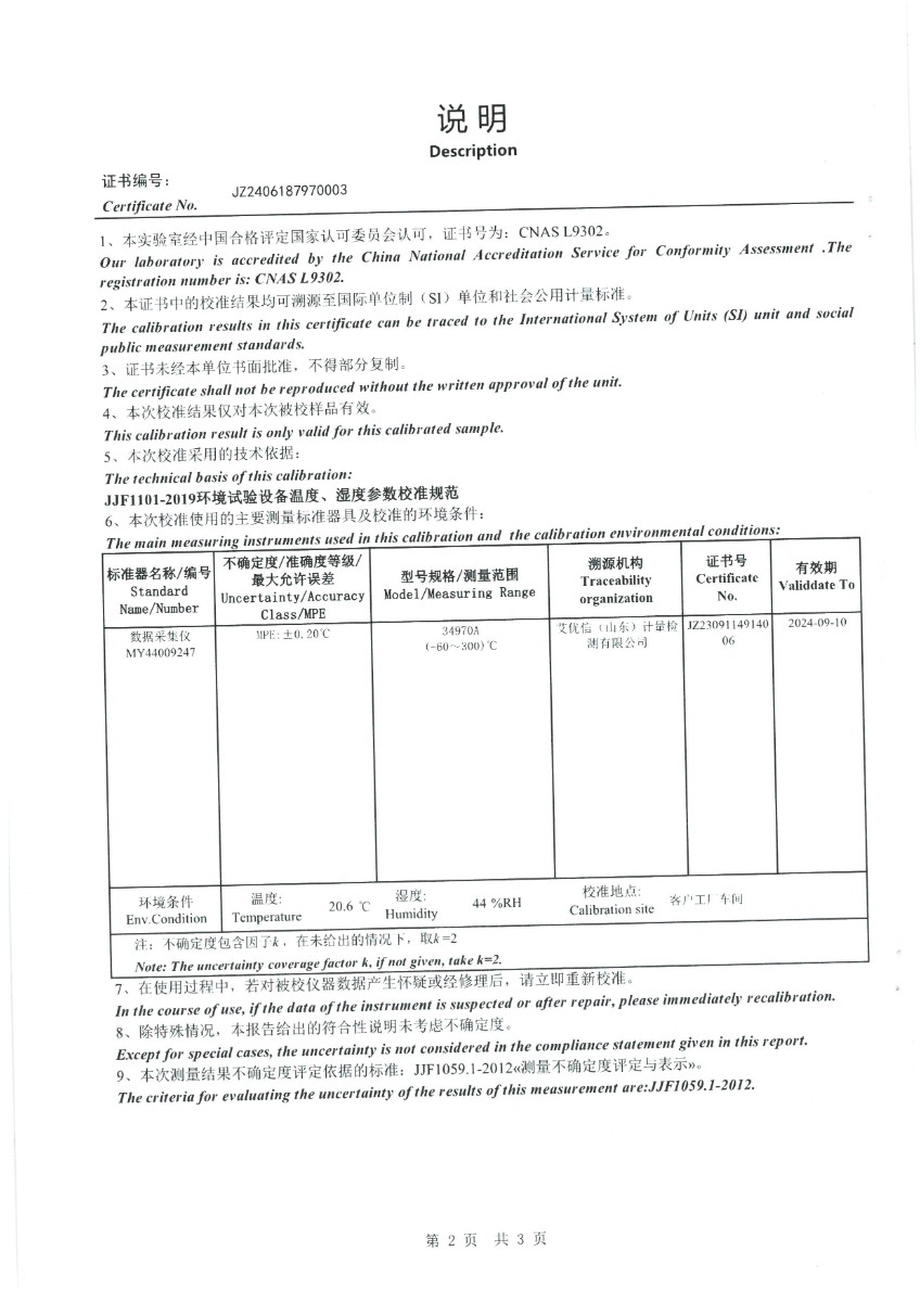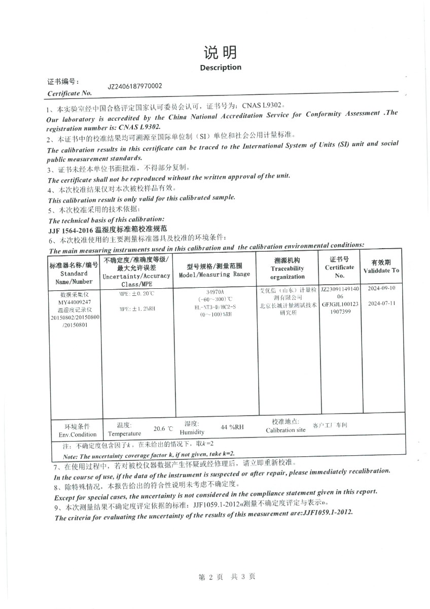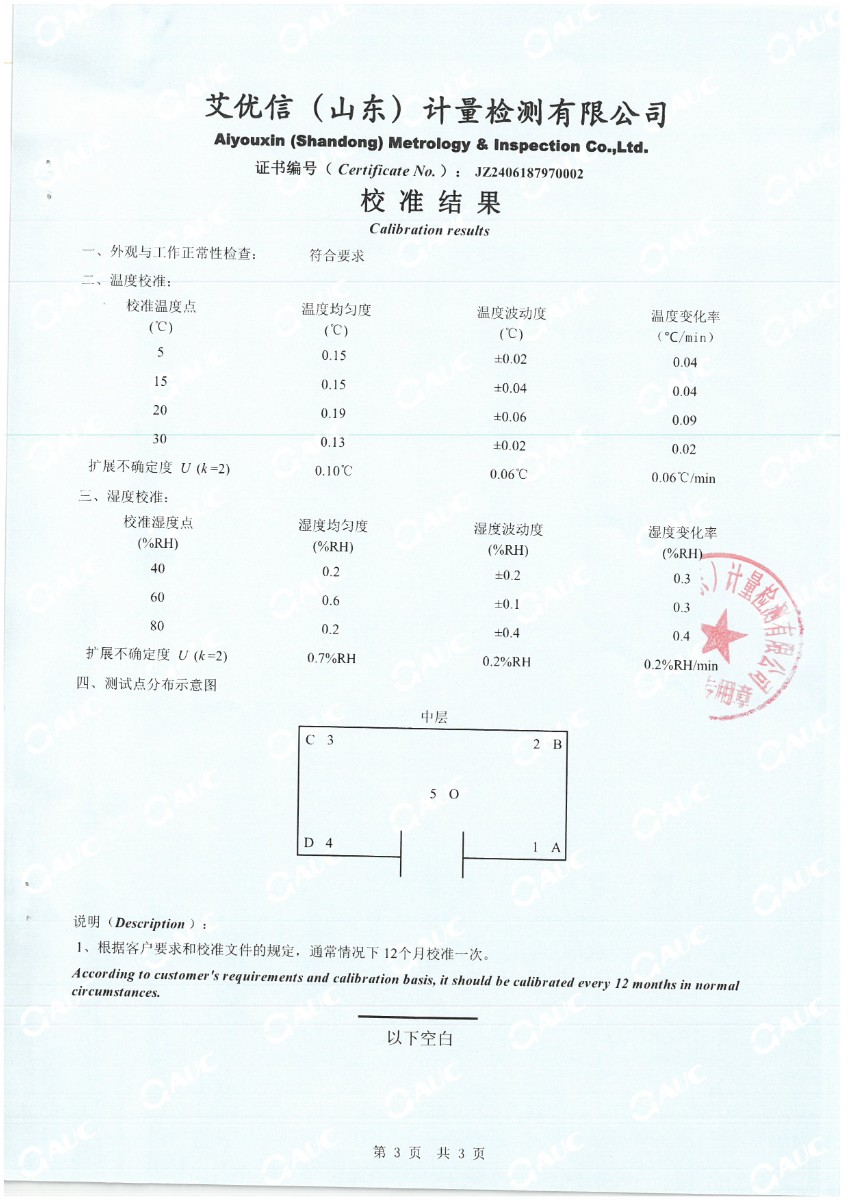 溫濕度檢定箱(-10~65℃)校準證書 2024-6-25 本文被閱讀 6450 次